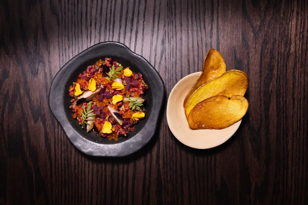 La carta de FANGO no es extensa, pero sí precisa. Ofrece bocados de autor con alma de cocina viajera y emocional: oreja con kimchi, panceta con yema curada, tartar de chuletón con pistacho… Cada uno de ellos es una puerta de entrada al universo FANGO, especialmente cuando se disfruta con los cócteles afinados de Palacios.